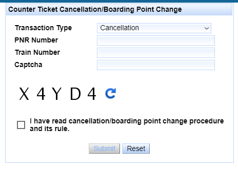 You will be taken to the counter ticket cancellation page of IRCTC. Enter your train number, PNR number, and captcha. Confirm the rules by checking the box. Click on the ‘Submit’ button.